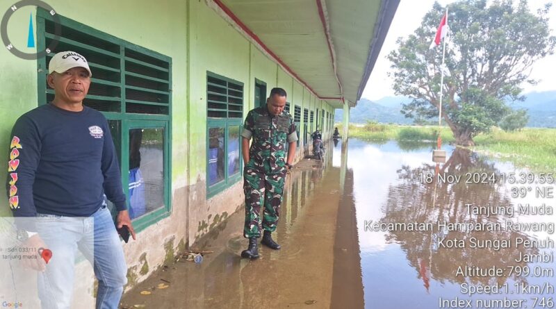 Sungai Penuh, MZK News – Komandan Kodim (Dandim) 0471/Kerinci Letkol Inf. Eko Budiarto didampingi Danramil Sungai Penuh Nasrul bersama Babinsa, memantau musibah bencana banjir yang melanda Desa Tanjung yang ada di Bantaran Sungai Batang Merao pada Senin (18/11).