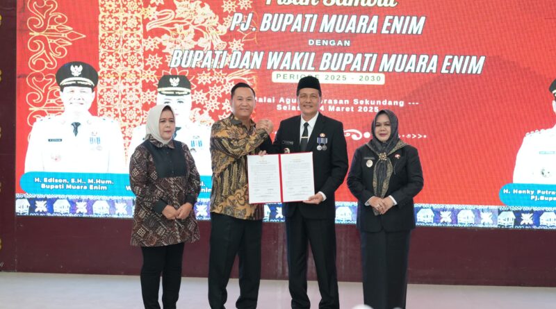 Muara Enim, MZK News – Pemerintah Daerah Kabupaten Muara Enim menggelar serah terima jabatan dari Pj. Bupati Muara Enim, H. Henky Putrawan, S.Pt., M.Si., M.M., kepada Bupati dan Wakil Bupati terpilih H. Edison, S.H., M.Hum., dan Ir. Hj. Sumarni, M.Si., yang berlangsung di Balai Agung Serasan Sekundang (BASS), Selasa (04/03).