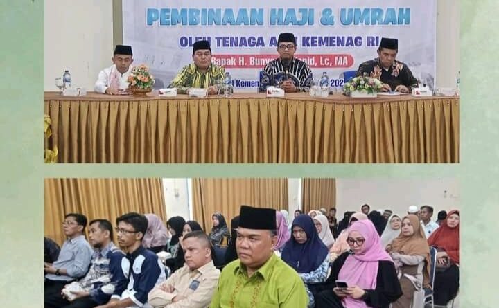 Materi pembinaan ini diberikan langsung oleh Tenaga Ahli Kementerian Agama RI, H. Bunyamin M Yapid, Lc., M.A., dan didampingi oleh Ka. Kanwil Kemenag Provinsi Sumbar, Dr. Mahyudin, M.A., serta Kabid Haji dan Umrah, H. Rifki Deflaizar.