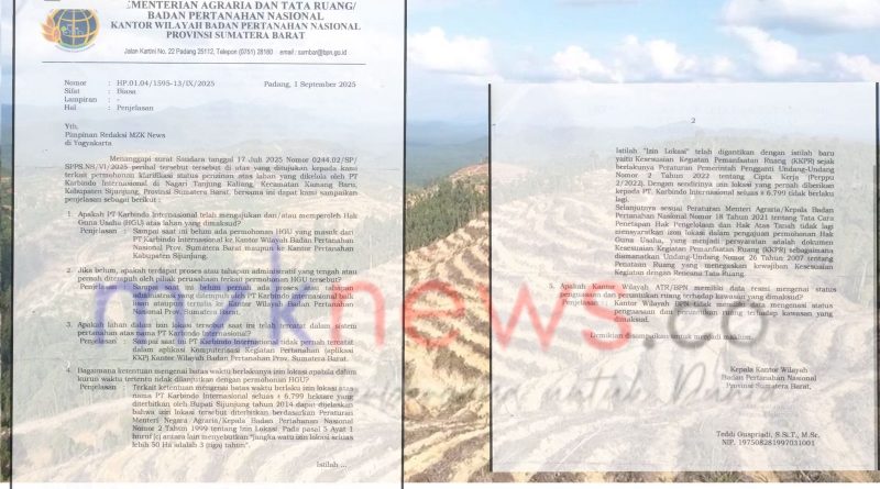 Sijunjung, MZK News – Skandal penggundulan hutan di Nagari Tanjung Kaliang, Kecamatan Kamang Baru, Kabupaten Sijunjung, kembali membuat publik terkejut. Fakta terbaru yang diperoleh dari surat resmi Kantor Wilayah ATR/BPN Provinsi Sumatra Barat yang dilayangkan kepada redaksi mzknews.co dengan tegas menyatakan bahwa PT Karbindo Internasional tidak memiliki Hak Guna Usaha (HGU) atas lahan seluas 6.799 hektare yang digunduli sejak izin lokasi diterbitkan tahun 2014.