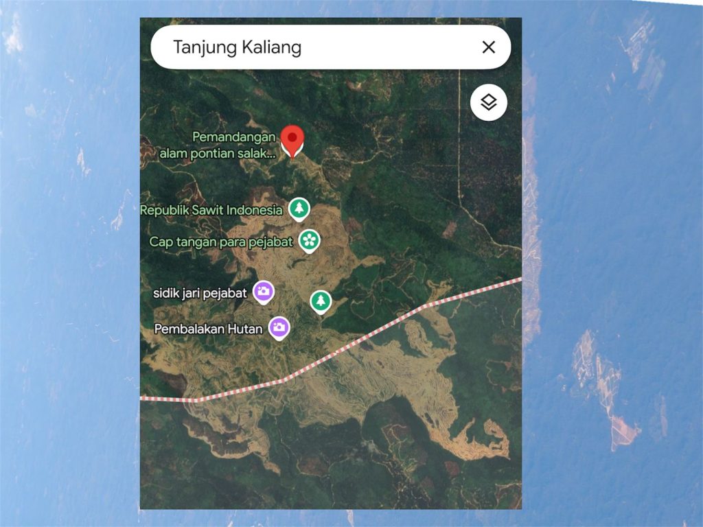 Citra satelit Google Maps memperlihatkan bentang hutan yang berubah drastis menjadi area terbuka luas. Garis-garis bukaan lahan tampak jelas dan membelah kawasan hijau yang sebelumnya masih utuh.