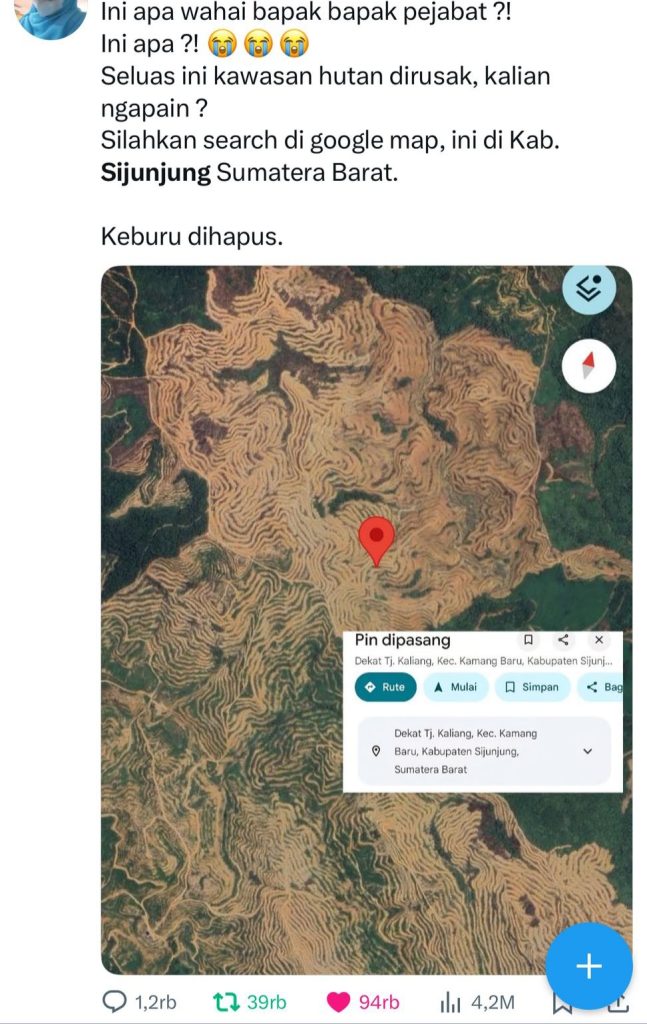 Sijunjung, MZK News – Aktivitas pembukaan lahan skala besar di Kecamatan Kamang Baru, Kabupaten Sijunjung, Sumatera Barat, langsung menyedot perhatian publik nasional. Warganet menemukan jejak pembukaan hutan tersebut melalui Google Maps dengan jumlah tampilan mencapai 4,2 juta view, lalu ramai membicarakannya di media sosial Platfom X (Twiter).